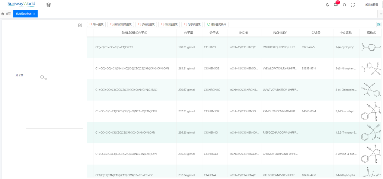 SW-RDMS支持對注冊的化合物進行多種方式的檢索查詢,如通過基本信息檢索查詢、通過已知的結構式精確搜索或相似性搜索、通過部分母核結構進行子結構搜索等。