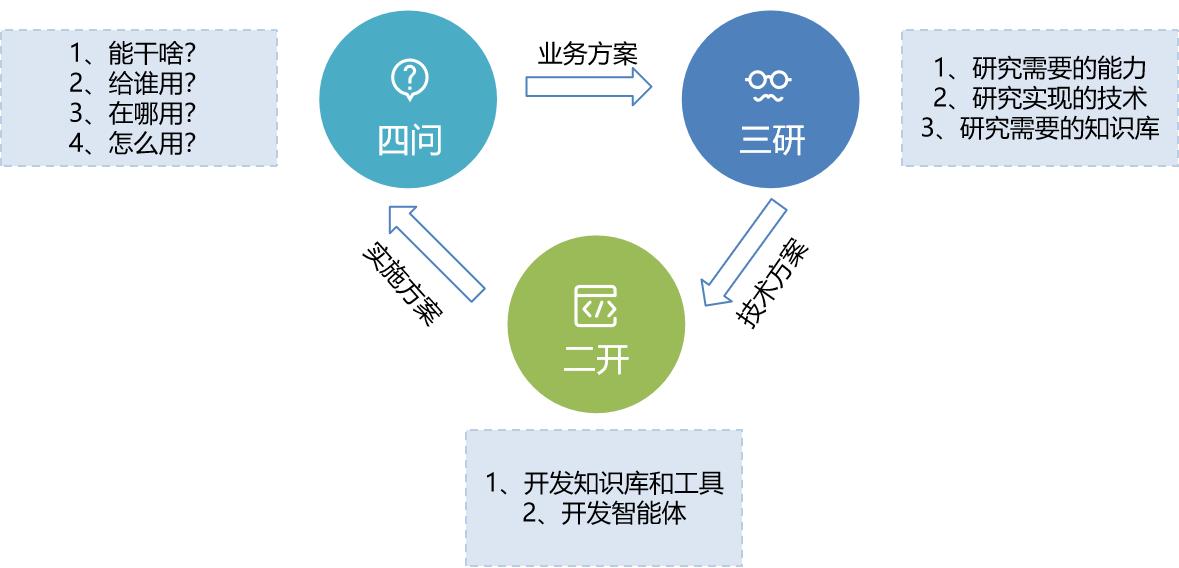 2、三研:研究需要的能力、研究實現的技術、研究需要的知識庫,是智能體“設計階段”需要研究的內容,主要進行智能體開發的可行性分析和實現路徑設計,該階段最終輸出技術方案。