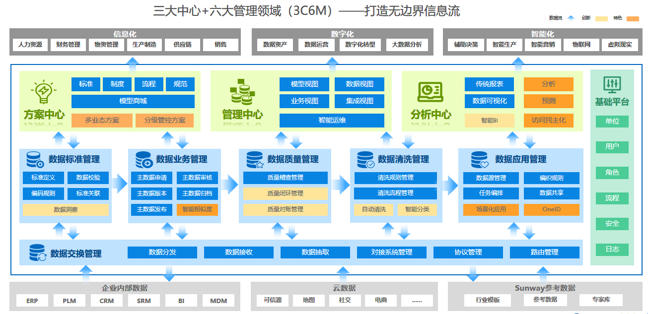 北京三維基于在主數(shù)據(jù)管理領(lǐng)域深耕細(xì)作,整合為眾多特大型央企和集團(tuán)型企業(yè)的項(xiàng)目建設(shè)經(jīng)驗(yàn),融合了數(shù)據(jù)標(biāo)準(zhǔn)管理、數(shù)據(jù)生命周期管理、數(shù)據(jù)交換管理、數(shù)據(jù)質(zhì)量管理、數(shù)據(jù)清洗管理、數(shù)據(jù)應(yīng)用管理六大模塊,方案中心、分析中心、管理中心三大中心以及Mobile移動(dòng)辦公,打造3C6M—體化主數(shù)據(jù)管理解決方案,為客戶提供從標(biāo)準(zhǔn)建立、數(shù)據(jù)質(zhì)量管控、數(shù)據(jù)交換應(yīng)用、數(shù)據(jù)治理,到企業(yè)數(shù)據(jù)方案中心建設(shè)、數(shù)據(jù)場(chǎng)景化的深入應(yīng)用、智能化數(shù)據(jù)管理、智能化運(yùn)維等全面的管控、洞察、應(yīng)用一體化解決方案,為企業(yè)數(shù)據(jù)標(biāo)準(zhǔn)化建設(shè)、數(shù)據(jù)治理提供強(qiáng)大支持,助力企業(yè)實(shí)現(xiàn)無(wú)邊界信息流。